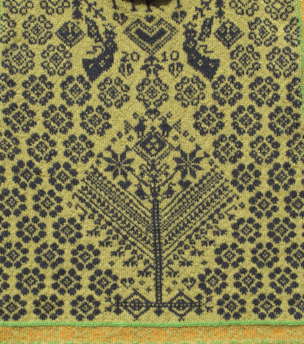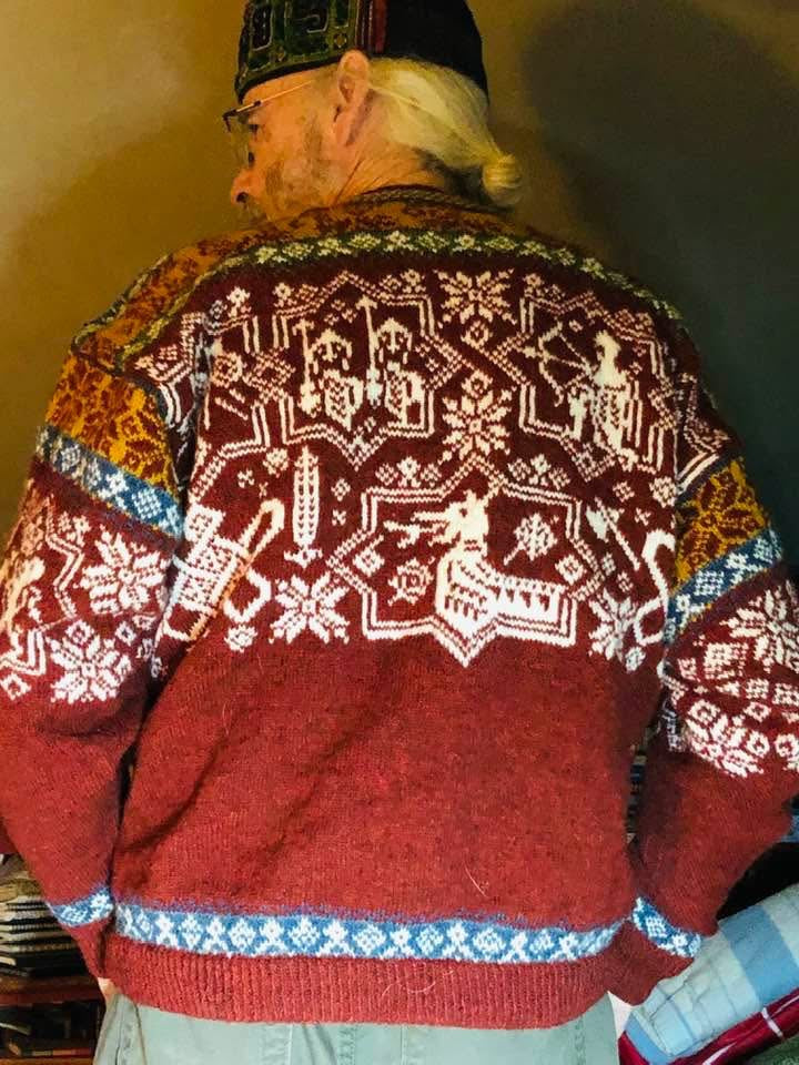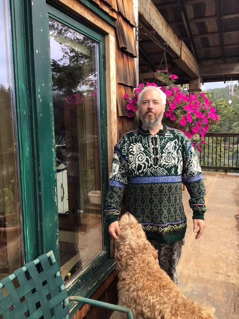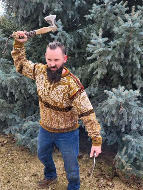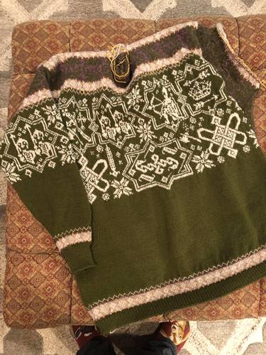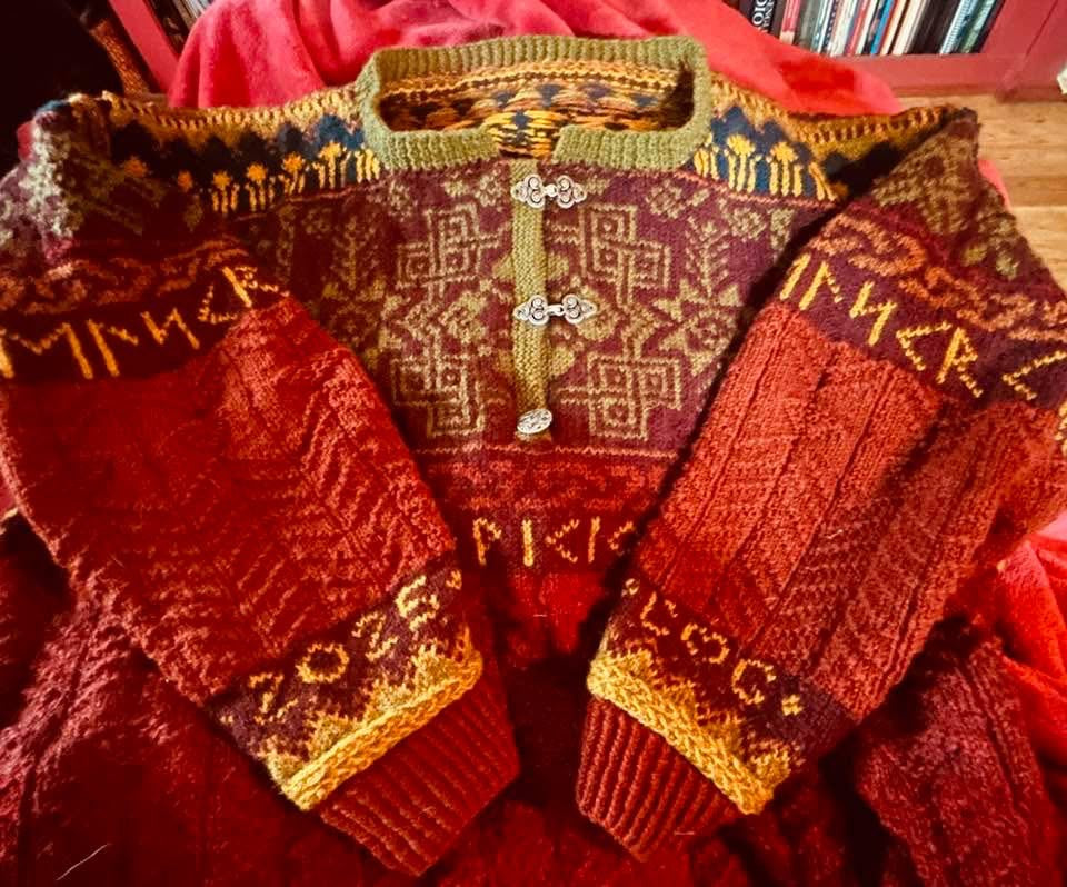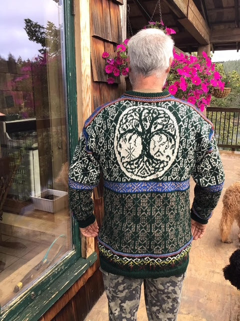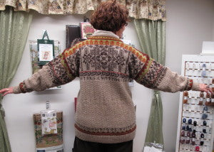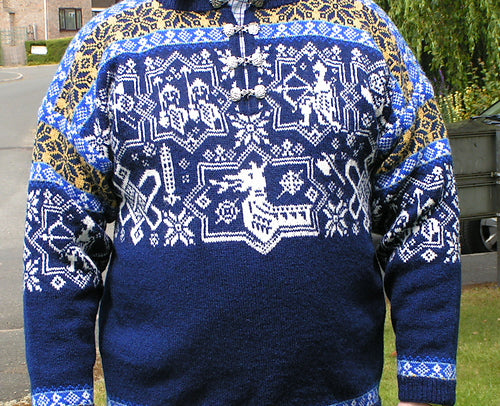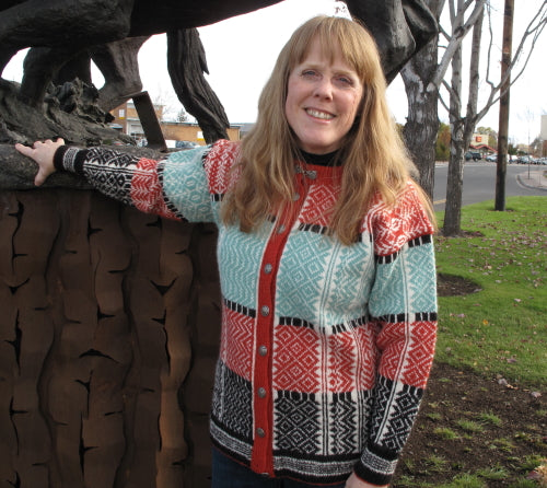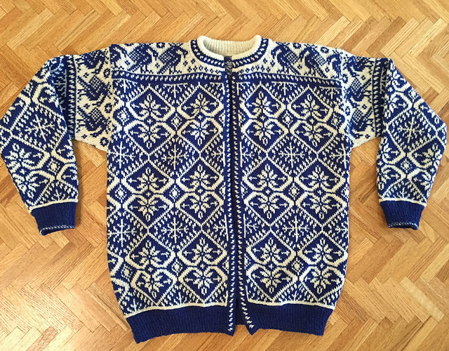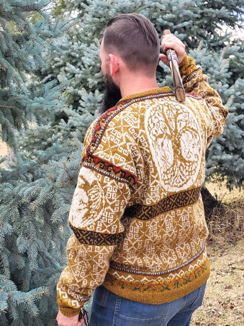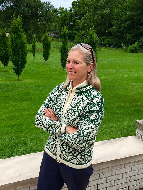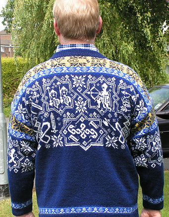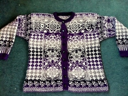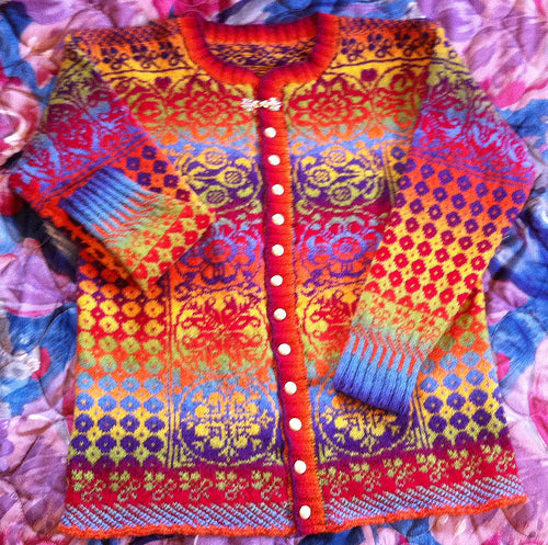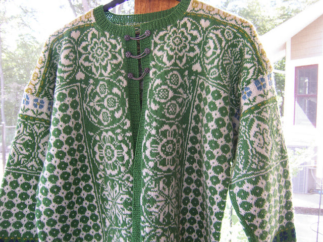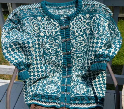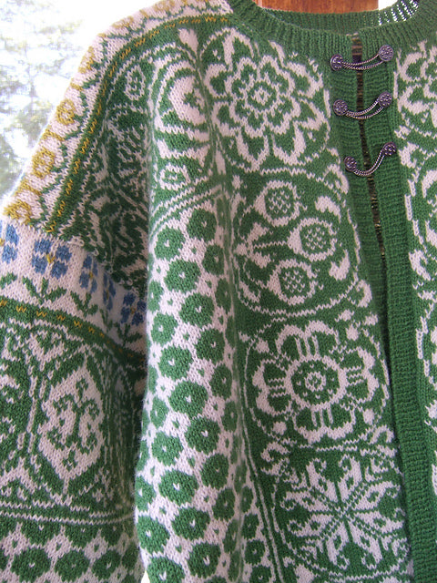 Unisex cardigan knit in Rauma Finullgarn and Tumi. PDF includes charts and instructions for six sizes. This sweater is knit from the bottom up with a steek for the front.