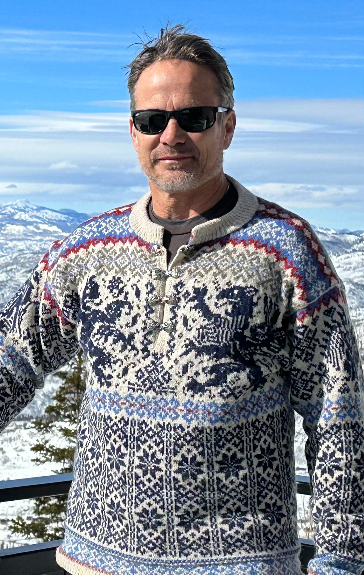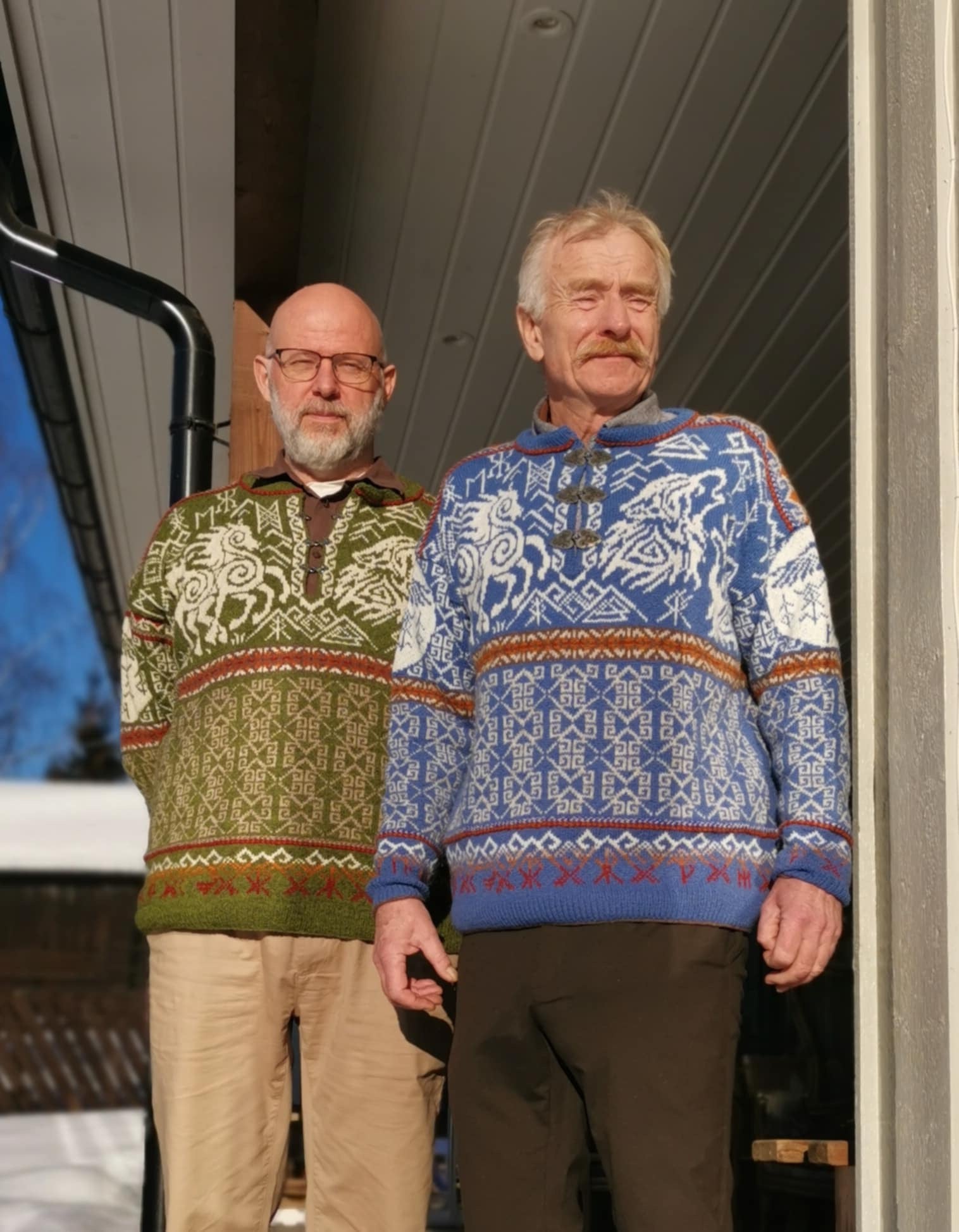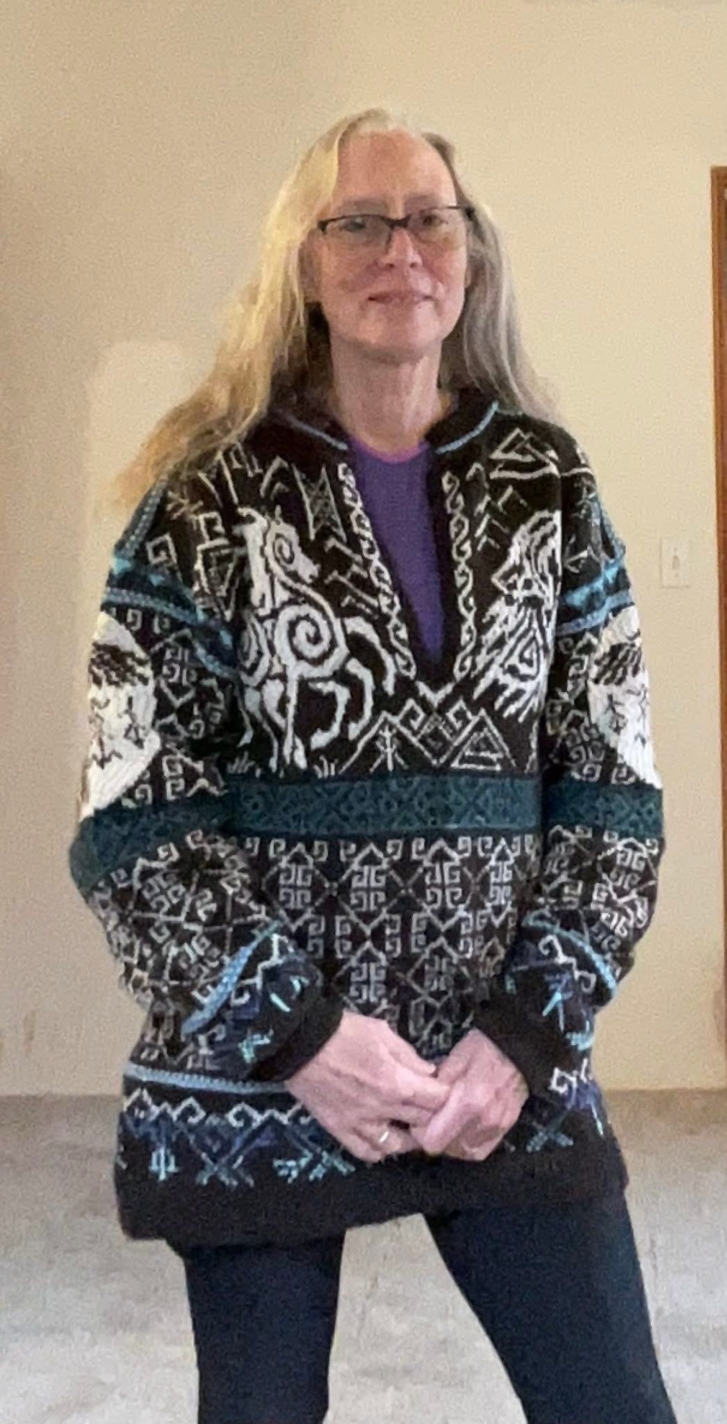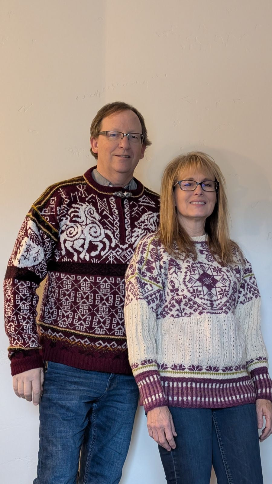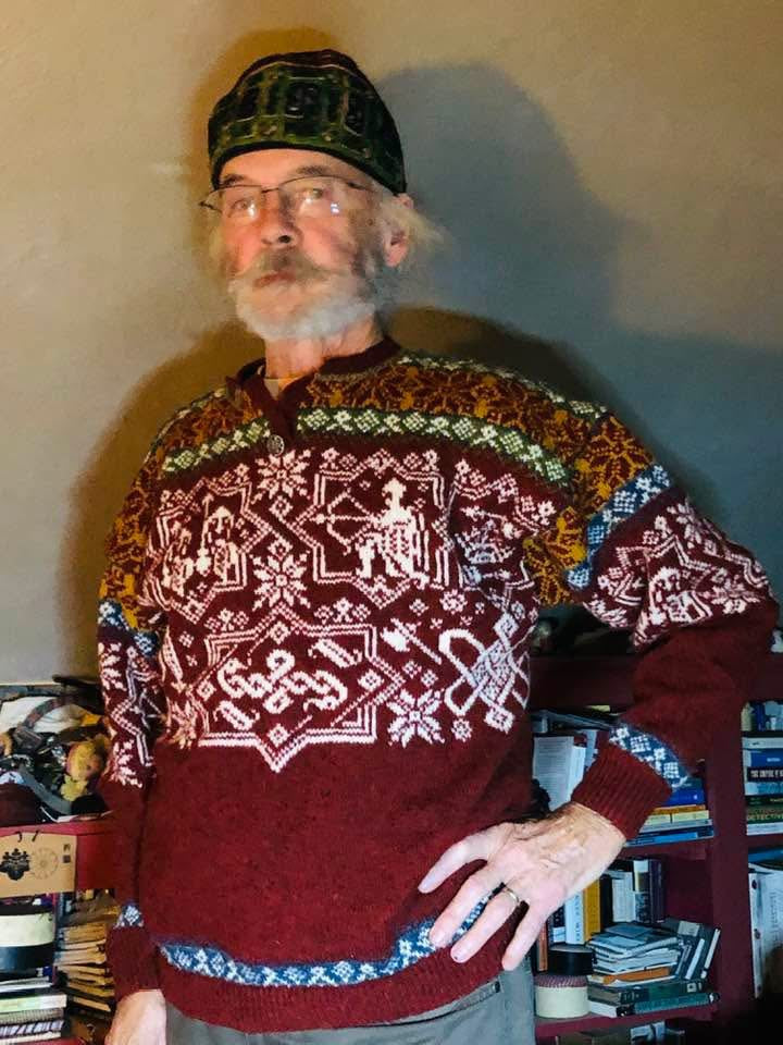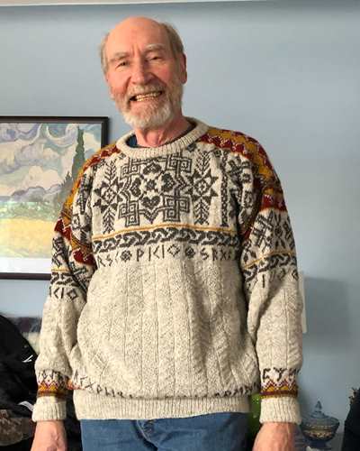 Unisex cardigan knit in Rauma Finullgarn and Tumi. PDF includes charts and instructions for six sizes. This sweater is knit from the bottom up with a steek for the front.